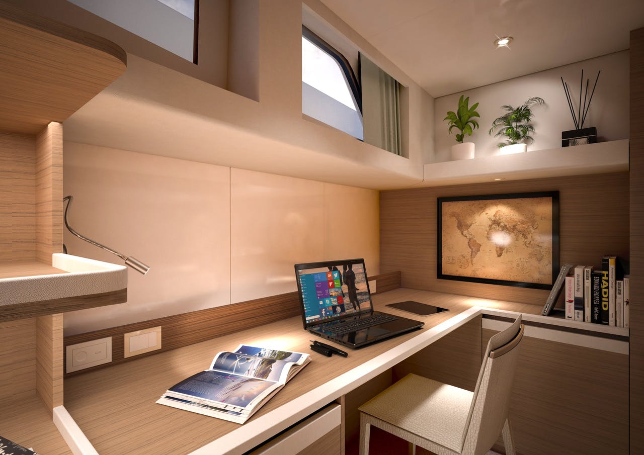 This new boat will also feature an elegant office space instead of the standard third cabin. It occupies a space on the starboard side of the hull, between the two exceptional double cabins for the owner and their guests. The solar panels will help to power high-speed internet and IT in this space, enabling the owner to stay away from port for longer.