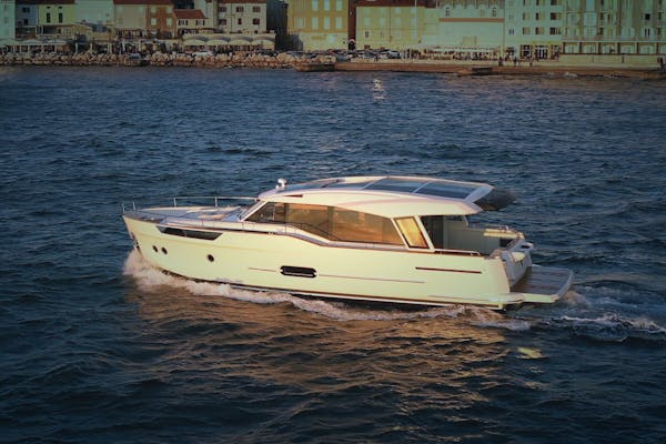 Las líneas del 48 Coupé se asemejan a las de su buque hermano, el 48 Fly, para lograr un aspecto clásico y moderno en el agua, con algunas de las características distintivas de Greenline, como las grandes ventanas del salón, las cubiertas laterales protegidas y la característica abertura de la amurada en la proa.