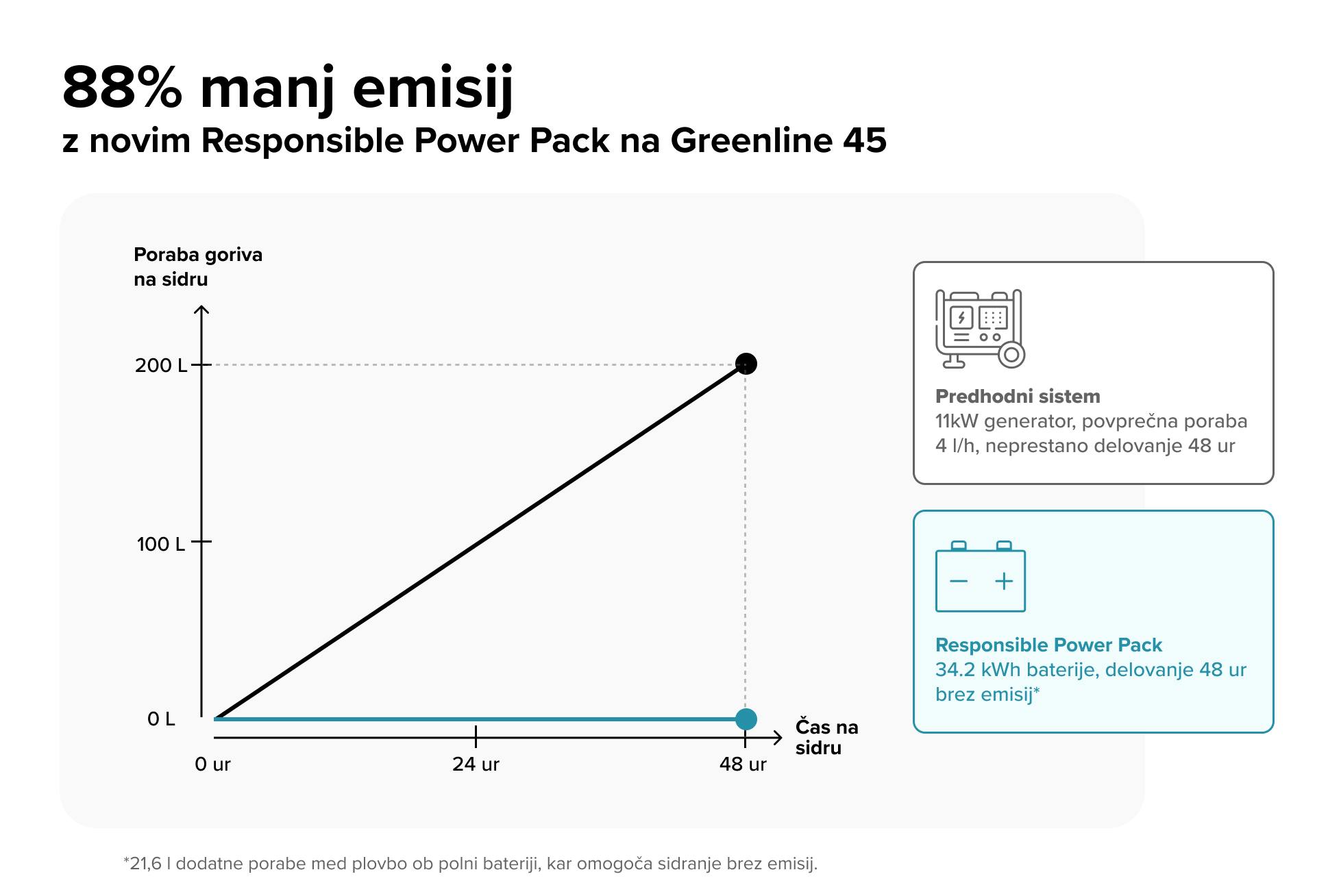 Greenline Yachts je naredil nov, pomemben korak v smeri filozofije Responsible Yachting z alternativnimi rešitvami, ki nadomeščajo zastarel koncept generatorjev. Nova tehnologija Responsible Power Pack, ki združuje večje baterijske kapacitete in alternatorje, omogoča zmanjšanje emisij brez kompromisov pri uporabi jahte. Med drugimi prednostmi lahko vsi modeli zdaj zagotavljajo vsaj 48 ur tihega delovanja na baterije, ko je jahta zasidrana na morju ali privezana v marini. Lastniki lahko uporabljajo vse naprave, vključno s klimo pri polni moči, in uživajo v svojem domu na morju brez hrupa, vibracij ali vonja generatorja. Poleg tega tehnologija bistveno zmanjša porabo goriva.